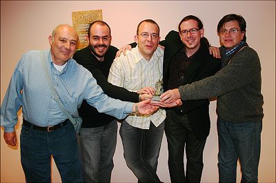 Pachi Tapiz y parte del equipo de Tomajazz en Madrid con la estatuílla.