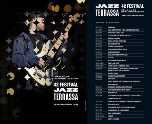 El 42è Festival Jazz Terrassa, extenderá su alfombra jazzística a lo largo de dos semanas y media, entre el 8 y el 26 de marzo. En el apartado internacional contará con el dúo Paolo Fresu & Omar Sosa (10/3), “White Cities” del pianista Gerald Clayton (11/3), “Impressions of Ella” de la cantante Robin McKelle (23/3), el baterista Ulysses Owens Jr. & Generation Y (23/3) o el pianista Monty Alexander, (26/3), que clausurará el festival. La clásica noche blues será a cargo de la cantante E. C. Scott (17/3).