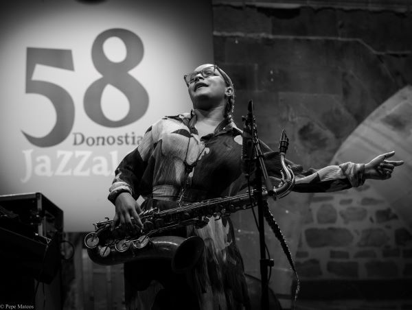 Dicen que el jazz tiene límites imprecisos, incluso algunos defienden que simplemente no tiene límites o fronteras musicales. Desde luego, el público que estaba sentado en la Plaza de la Trinidad, lo que sí pudieron comprobar es que el espectro donde se mueven sus artistas es amplísimo. Nubya Garcia y su cuarteto nos demostraron algunas claves por las que se mueve actualmente el jazz en un espacio concreto, condicionado por ese crisol de culturas que es el Candem Town londinense. Un espacio donde desde hace décadas conviven y se funden culturas diferentes donde el jazz, el reggae, el soul, el calypso, la samba, la cumbia, la música africana y un largo etcétera son el condimento necesario para buscar sonidos nuevos y nuevas formas de expresión. Nubya Garcia viene de ese mundo y forma parte de un colectivo de figuras emergentes con las que colabora habitualmente: Moses Boyd, Theon Cross, Makaya McCraven, Shabaka Hutchings, Ezra Colective, Jazz Ahmed y muchos otros, la mayoría se conocieron a través de una iniciativa pública, los talleres del “Tomorrow´s Warriors” pensados para promover a músicos jóvenes. Después de grabar varios EP y tomarse su tiempo para componer, Nubya Garcia saca su disco Source (Concord Record 2020), que le abre puertas en todo el mundo, dentro y fuera del jazz. Y con el repertorio de este disco se presenta la saxofonista londinense en el 58º Jazzaldia, eso sí, sin las múltiples colaboraciones que intervienen en el disco, pero con el eje central de músicos que formó parte de la grabación, músicos británicos, con los que lleva girando por todos los continentes los últimos tres años: el pianista y teclista Joe Armon Jones; el contrabajista Daniel Casimir; y el batería Sam Jones, con los que forma un núcleo compacto que ha incorporado la esencia de lo que Nubya García pretende con su música. En alguna reseña definen a Nubya Garcia como una saxofonista que toca con un estilo intenso y frenético, subscribo el primer adjetivo pero no el segundo, creo que desprende una gran energía, pero lo hace de una manera muy medida y razonada, la música de Nubya es un collage de influencias que la saxofonista va administrando en sus composiciones, buscando un resultado colectivo, que es más evidente en el disco por las aportaciones de las colaboraciones que ha incluido, las voces de Ms Maurice, Cassie Kinoshi y Richie Seivwright, integrantes de Nérija y Kokoroko dos grupos de los que Nubya Garcia fue parte activa, la intervención, esta vez con la trompeta también de Ms Maurice o sus guiños a la cumbia con la intervención del grupo colombiano La Perla, son evidencias de la búsqueda de la saxofonista para integrar sus propias influencias, que suple perfectamente en sus directos con el dialogo permanente y coherente entre los miembros del cuarteto. Sonido potente, electrificado, moderno pero que llama constantemente a raíces profundas y diversas de la música que la saxofonista siente.