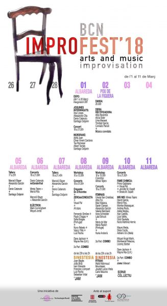 Entre el 1 y el 11 de marzo de 2018 tendrá lugar el BCN ImproFest’18 con conciertos, exposiciones, workshops, talleres que tendrán lugar en el Centre Cultural Albareda, Pou de la Figuera y Sinestesia. Toda la información y los detalles están disponibles en la web del festival: https://bcnimprofest.tumblr.com/