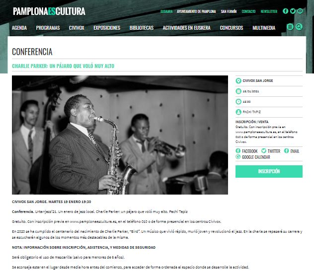 ![Charla "Charlie Parker: un pájaro que voló muy alto" (Urtarrijazz'21. Martes 19 de enero de 2021. Pamplona, Navarra) [Noticias de jazz] 5 Tomajazz Charla "Charlie Parker: un pájaro que voló muy alto" (Urtarrijazz'21. Martes 19 de enero de 2021. Pamplona, Navarra) [Noticias de jazz] Charla "Charlie Parker: un pájaro que voló muy alto" (Urtarrijazz'21. Martes 19 de enero de 2021. Pamplona, Navarra) [Noticias de jazz] 5](https://tomajazz.com/web/wp-content/uploads/2021/01/Charla-Charlie-Parker-Un-pajaro-que-volo-muy-alto.jpg)