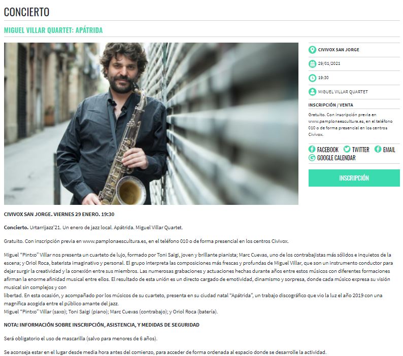 ![Miguel "Pintxo" Villar "Apátrida" (Urtarrijazz'21. Viernes 29 de enero de 2021. Pamplona, Navarra) [Noticias de jazz] 3 Tomajazz Miguel "Pintxo" Villar "Apátrida" (Urtarrijazz'21. Viernes 29 de enero de 2021. Pamplona, Navarra) [Noticias de jazz] Miguel "Pintxo" Villar "Apátrida" (Urtarrijazz'21. Viernes 29 de enero de 2021. Pamplona, Navarra) [Noticias de jazz] 3](https://tomajazz.com/web/wp-content/uploads/2021/01/Urtarrijazz-2021_Miguel-Pintxo-Villar-Apatrida.jpg)
