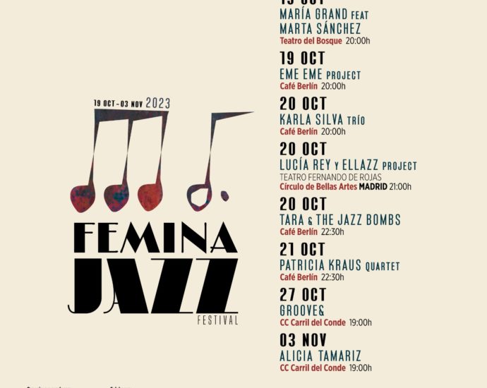 ![5º FeminaJazz 2023 (Móstoles y Madrid. 19 de octubre al 1 de noviembre de 2023) [Noticias de jazz] 4 Tomajazz 5º FeminaJazz 2023 (Móstoles y Madrid. 19 de octubre al 1 de noviembre de 2023) [Noticias de jazz] 5º FeminaJazz 2023 (Móstoles y Madrid. 19 de octubre al 1 de noviembre de 2023) [Noticias de jazz] - Tomajazz 9.0 - Entre el 19 de octubre y el 3 de noviembre de 2023 tendrá lugar en Móstoles y Madrid el 5º FeminaJazz 2023 #Ciclodejazz #FestivalDeJazz #Festivalesdejazz #Noticiasdejazz](https://tomajazz.com/web/wp-content/uploads/2023/09/Femina-Jazz-2023-Final-1-690x550.jpg)
