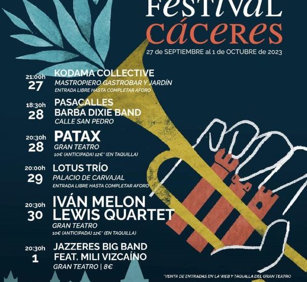 ![IV Jazz Festival Cáceres 2023 (Cáceres. 27 de septiembre al 1 de octubre de 2023) [Noticias de jazz] 5 Tomajazz IV Jazz Festival Cáceres 2023 (Cáceres. 27 de septiembre al 1 de octubre de 2023) [Noticias de jazz] IV Jazz Festival Cáceres 2023 (Cáceres. 27 de septiembre al 1 de octubre de 2023) [Noticias de jazz] - Tomajazz 9.0 - Entre el 27 de septiembre y el 1 de octubre de 2023 tendrá lugar en Cáceres, el IV Jazz Festival Cáceres 2023 #Ciclodejazz #FestivalDeJazz #Festivalesdejazz #Noticiasdejazz](https://tomajazz.com/web/wp-content/uploads/2023/09/IV-Jazz-Fesival-Caceres-2023-Tomajazz-Noticias-600x550.jpg)