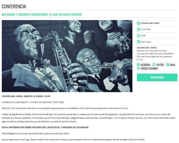 ![Charla "Big Bands y grandes formaciones: el jazz en gran formato" (Urtarrijazz'21. Martes 12 de enero de 2021. Pamplona, Navarra) [Noticias de jazz] 2 Tomajazz Charla "Big Bands y grandes formaciones: el jazz en gran formato" (Urtarrijazz'21. Martes 12 de enero de 2021. Pamplona, Navarra) [Noticias de jazz] Charla "Big Bands y grandes formaciones: el jazz en gran formato" (Urtarrijazz'21. Martes 12 de enero de 2021. Pamplona, Navarra) [Noticias de jazz] 2](https://tomajazz.com/web/wp-content/uploads/2021/01/Charla-Big-Bands-600x479.jpg)