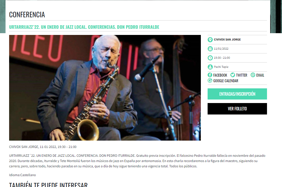 ![Charla "Don Pedro Iturralde" (11 de enero de 2022. Urtarrijazz '22, Civivox San Jorge, Pamplona) [Noticias de Jazz] 2 Tomajazz Charla "Don Pedro Iturralde" (11 de enero de 2022. Urtarrijazz '22, Civivox San Jorge, Pamplona) [Noticias de Jazz] Charla "Don Pedro Iturralde" (11 de enero de 2022. Urtarrijazz '22, Civivox San Jorge, Pamplona) [Noticias de Jazz]](https://tomajazz.com/web/wp-content/uploads/2022/01/Urtarrijazz-2022-Charla-Don-Pedro-Iturralde_PamplonaEsCultural.png)