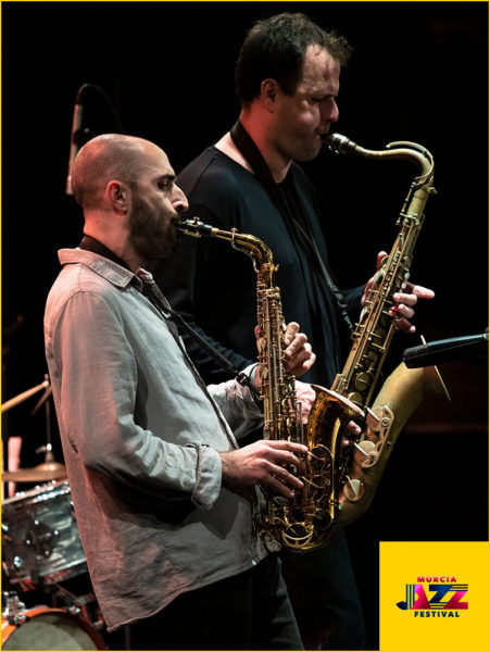 La sesión comenzó siguiendo el orden de los temas integrados en el disco, con la pieza “Intro”, realizada en solitario por el pianista Javier Bermejo, para dar paso a “Morriña”, una composición cargada de una fuerte energía rítmica, armónica y melódica, con cambios muy dinámicos, en la que lucieron las improvisaciones de los dos principales solistas, Enrique Oliver y Joan Saldaña, con extensos solos que llevaron la partitura hacia espacios sonoros de gran intensidad. El líder del quinteto anunció el siguiente tema llamado “Nefrén”, una composición muy lírica y mágica que iniciaron con una introducción del contrabajista Jesús Gea, pilar sólido e indiscutible de la formación, que vino sustituyendo a Andrés Lizón, contrabajista original del grupo en la grabación. Tras la exposición conjunta de los vientos, fue Saldaña el encargado de desarrollar el primer solo, bien construido, largo y muy expresivo, desplegando intensos fraseos sobre la estructura. Oliver desarrolló también su parte improvisada con un lenguaje muy sutil y fluido, y un sonido profundo y vigoroso. El buen groove creado por el grupo se mantuvo en toda la velada. En “Five Cities With Karen” destacaron los solos del pianista Bermejo, ágil y creativo en su intervención, y los diálogos superpuestos de los vientos, logrando un clímax excepcional.