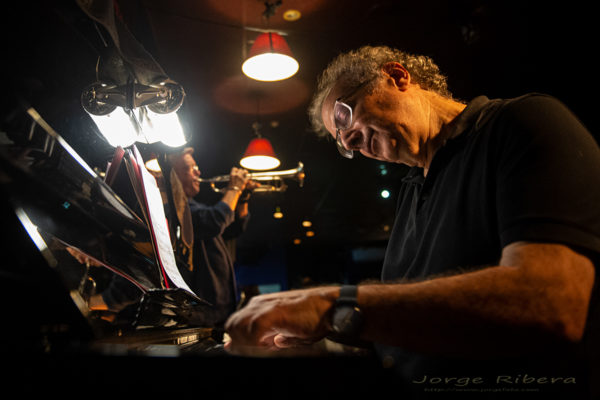 Suben los dos al escenario cuando llega Dave Douglas quien parece tomar el mando, al estar de pie junto al piano con su trompeta en la mano y su talante tan serio.