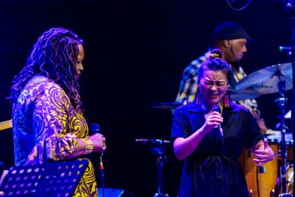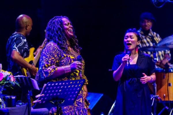 Reeves fue haciendo un recorrido por canciones de anteriores trabajos e incluso se atrevió con “Minuano” de Pat Metheny, coreada a dúo con la vocalista surcoreana invitada Song Yi Jeon, formando un tandem muy equilibrado, debido en parte a la similitud de su timbre vocal con Reeves. Song Yi tuvo también sus momentos de protagonismo en “Lôro” de Egberto Gismonti en un mano a mano con Lubambo, fraseando notas e intervalos con su scat que el guitarrista iba repitiendo. Con las dos vocalistas sobre el escenario fue acabando la generosa velada, fruto de una entrega total por parte del grupo y el público, a pesar de las sofocantes temperaturas que acompañaron la actuación. Reeves finalizó su concierto con “You Taught My Heart How To Sing” (Sammy Cann / McCoy Tyner), un tema que aparece en otro álbum de la cantante I Remenber (Blue Note Records, 1991), una muestra de la elegancia con la que interpreta la vocalista. La poderosa voz de Reeves navegó sobre el sostén armónico y rítmico creado por sus compañeros. Lubambo y Beasley enriquecieron todos los temas con elocuentes improvisaciones, para dar paso a las enérgicas improvisaciones vocales de la cantante.