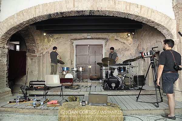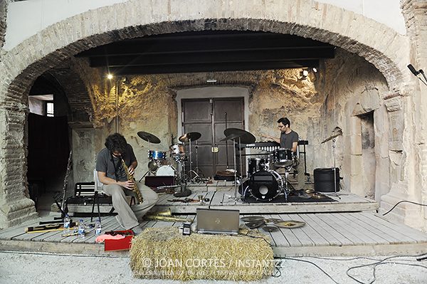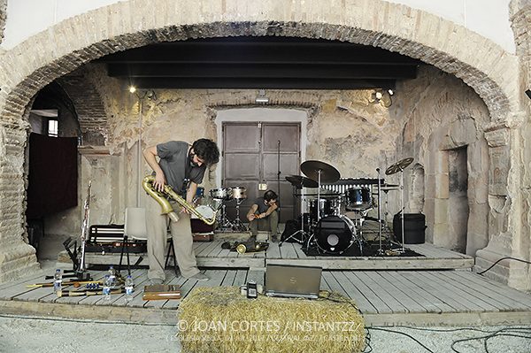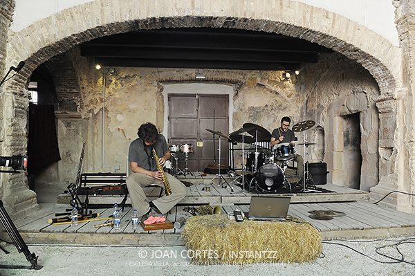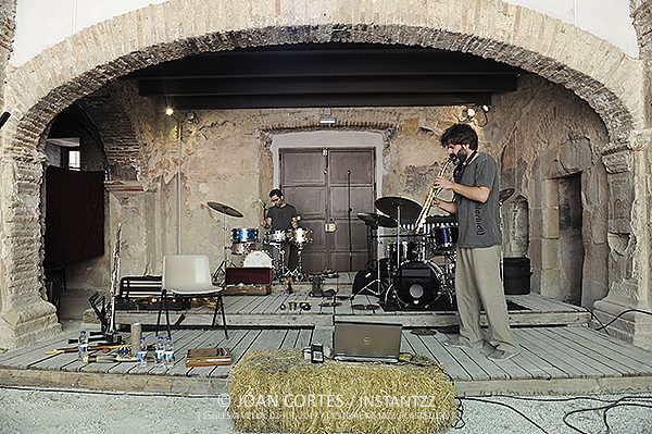 Pese al aparente y no tan aparente caos que saben configurar y conjugar, el escenario (dos plataformas de madera con distinto nivel) estaba escrupulosamente ordenado con una gran variedad de instrumentos (que a uno le hizo recordar, en parte y salvando la distancia de la memoria, la vistosidad y generosidad expositiva del mejor Art Ensemble of Chicago): saxo tenor y soprano, flautas, tenora, violín, pitos de sonidos ornitológicos, dos baterías dispuestas en diagonal, vibráfono, multitud de platos de diferente diámetro, más otros pitos y pequeños instrumentos de percusión. Un escenario plásticamente compensado y ligeramente cambiante a lo largo de la jornada.