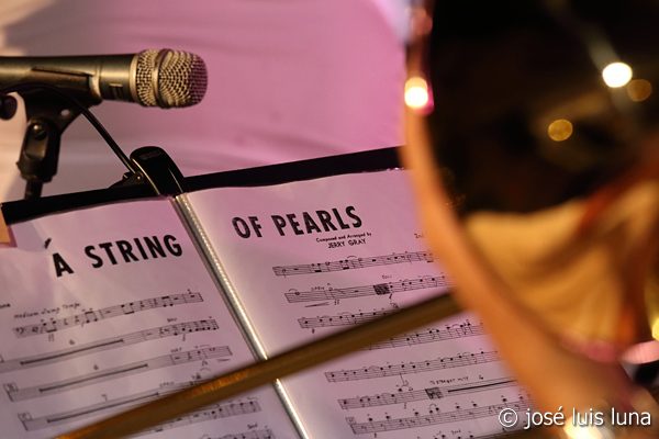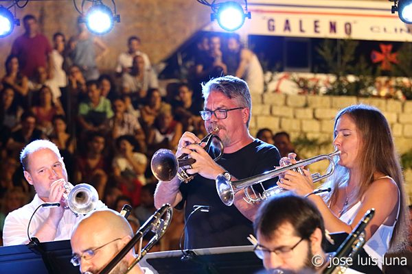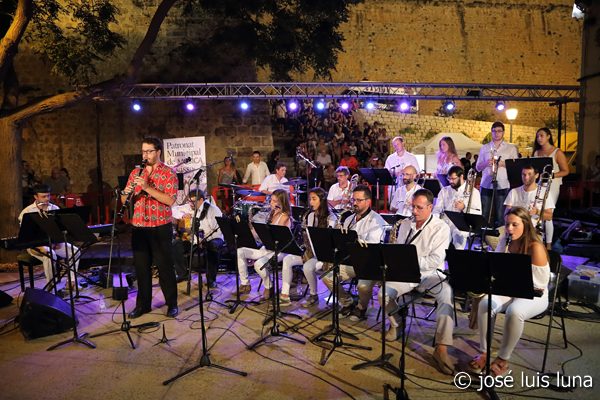 La orquesta sonó bien, con momentos de gran brillantez. Para empezar, al dinámico “In the Mood” le siguieron “Kansas City Shout”, “A String of Pearls” y “Red Bank Boogie”, al mismo nivel, con solos de Chelu García y Muriel Grossmann. Justo entonces, salió al escenario Arturo Pueyo, ibicenco afincado en Madrid y antiguo alumno del Patronato, continuando el concierto con piezas como “Clarinet a la King”, “King Porter Stomp”, “Back Bay Shuffle”, o Stompin’ at the Savoy”, con un Pueyo estupendo al clarinete y solos ocasionales de los mayores: Muriel Grossmann, Nacho Marí, Santi Ramírez y Vicent Tur –director de la Big Band–. En una de las pausas entre tema y tema, el clarinetista nos recordó lo fantástico que es que la gente acuda a festivales, pero también hay unas salas donde escuchar buena música. Para acabar, y no podía ser de otra manera en una noche dedicada a Benny Goodman, “Sing, Sing, Sing”, con Pueyo en su buena línea y un solo de Dani Marín que se llevó una gran ovación haciendo de Gene Krupa, con Chema Pellico y Radomir Milojkivic empujando como locomotoras al resto de la banda, y una sorpresa final, la aparición en el escenario de David Pastor –actuaba con el siguiente grupo– reforzando la sección de trompetas. De regalo y para acabar la diversión, “Woodchopper,s Ball”.