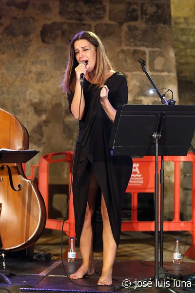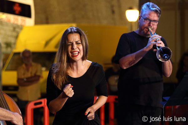 Tras la brillantez de la BBCE, pudimos disfrutar de una hermosa oscuridad, la recreación a cargo de Mariola Membrives de un disco fundamental en la música española: Omega, de Enrique Morente y Lagartija Nick, disco que celebra su vigésimo aniversario. Si el original ya era denso y un tanto oscuro, en Omega 20.16 Mariola y sus acompañantes –que pueden variar según la ocasión– nos ofrecen “Almas perdidas, muertos y dolor” recordando a Lorca. Dolor que se nos transmite desde las primeras notas de ese “Omega” con el que comenzaron su actuación. Horacio Fumero con una larga introducción al contrabajo, con parsimonia, preparando la aparición de Mariola sobre el escenario, descalza y de riguroso negro, agarrando los bajos de su vestido con el brazo izquierdo mientras con el derecho realiza gestos muy flamencos o lo proyecta hacia el público como queriendo transmitirles todo ese dolor y emoción que rebosa, con una voz que pasa del susurro al desgarro; se añaden los demás músicos, Oliver Haldon con la guitarra, David Pastor con un tenebroso sonido de trompeta casi de ultratumba y primeros aplausos tras un solo de Oriol Roca a la batería. Más que fusión entre estilos, diremos que toman elementos del flamenco y del jazz para crear algo que trasciende a ambas músicas.