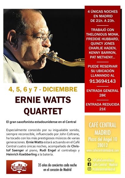 Ernie Watts Quartet actuará en Café Central (Plaza del Ángel, Madrid), entre el 4 y el 7 de diciembre de 2017. Al saxofonista Ernie Watts le acompañan Christof Saenger al piano, Rudi Engel al contrabajo y Heinrich Koebberling a la batería. Toda la información en http://www.cafecentralmadrid.com/
