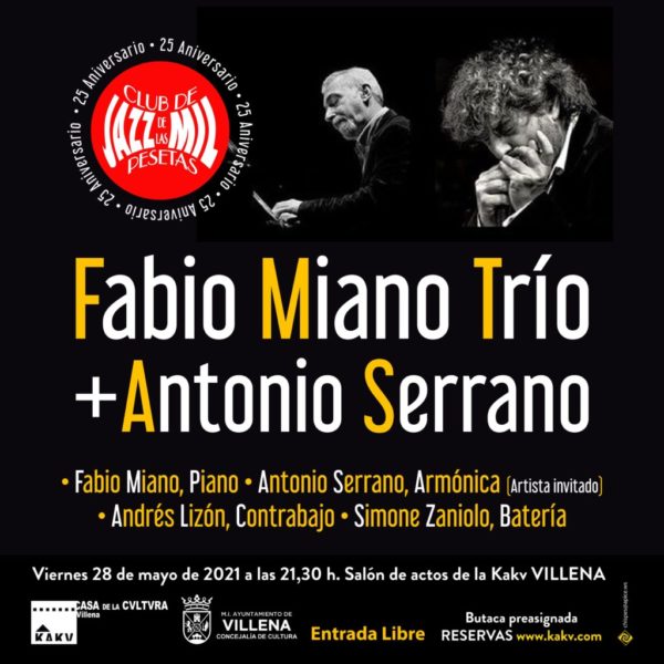 ![Fabio Miano Trío + Antonio Serrano (25º Aniversario de Club de Jazz de las Mil Pesetas. Villena) [Noticias de jazz] 1 Tomajazz Fabio Miano Trío + Antonio Serrano (25º Aniversario de Club de Jazz de las Mil Pesetas. Villena) [Noticias de jazz] Fabio Miano Trío + Antonio Serrano (25º Aniversario de Club de Jazz de las Mil Pesetas. Villena) [Noticias de jazz] 1](https://tomajazz.com/web/wp-content/uploads/2021/05/25-Anivesario-Club-de-jazz-de-las-mil-pesetas-2021-fabio-miano-trio-y-antonio-serrano-1024x1024-1.jpg)