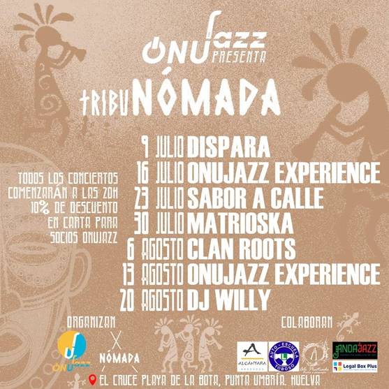 En Punta Umbría, Huelva, la asociación ÓnuJazz, organiza el Segundo Los Miércoles a La Playa. Del 6 de julio al 10 de agosto, conciertos en el Chiringuito Enebral en la playa de la Bota de Punta Umbria y los sábados, entre el 9 de julio y el 20 de agosto, TribuNómada, en el Cruce de la Bota, también en Punta Umbria.