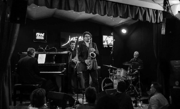 La banda inició la sesión con “The Last Call”, una composición original de Valverde, que fue expuesta con decisión por la compacta sección rítmica y la melodía del saxo tenor. Valverde y Pérez fueron los solistas protagonistas en el desarrollo de esta dinámica pieza. El tema “Three Years Ago”, incluido en el primer álbum del saxofonista, Looking Forward (Ammus Records, 2012) planeó elegante sobre la delicada base armónica del piano y el elocuente acompañamiento del contrabajo, marcado por los sutiles y ajustados toques del baterista. Cada componente del grupo aportó sus composiciones al repertorio, como en el caso del tema “Minor Something” del baterista Raphael Nick, en el que todos los músicos participaron con sus diferentes improvisaciones, lo cual le otorgó una gran pluralidad emocional a la pieza. Uno de los temas más elaborados fue “Mountain Walk” del pianista Evaristo Pérez, que da titulo al disco grabado por el trío, Mountain Walk (Unit Records, 2017). El ambiente etéreo de la introducción dio paso una bella exposición melódica compartida entre el piano y el saxo tenor, que recordaba a aquellas composiciones del gran pianista sueco Esbjörn Svensson. El contrabajo de Gysler fue el primero en arrancar en las ruedas de solos, con envolventes fraseos y un sonido bien temperado. Pérez protagonizó aquí un solo cargado de lirismo y fogosidad, mostrándonos su excelente y fluido manejo del piano, dejando la parte final al saxo tenor para despedir la pieza con la intensidad necesaria. La primera parte del concierto acabó con otra partitura inédita de Valverde, “Song For Mauricio”, dedicada a un amigo del compositor. El vigor y la frescura del tema elevaron la atmósfera del local, generando efusivos aplausos y vítores.