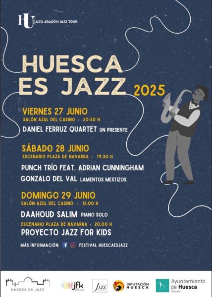 ![Huesca es Jazz 2025 (27 al 29 de junio de 2025) [Noticias de jazz] Tomajazz Huesca es Jazz 2025 Noticias Tomajazz Huesca es Jazz 2025 (27 al 29 de junio de 2025) [Noticias de jazz] - Tomajazz - Huesca es Jazz 2025 se celebrará del 27 al 29 de junio en la ciudad de Huesca. El festival contará con actuaciones en el Salón Azul del Casino y en el Escenario Plaza de Navarra. La programación incluye a Daniel Ferruz Quartet, Punch Trío con Adrian Cunningham, Gonzalo del Val, Daahoud Salim y el Proyecto Jazz for Kids. Toda la información está disponible en las redes sociales oficiales del festival: @festivalhuescaesjazz #Noticiasdejazz](https://tomajazz.com/web/wp-content/uploads/2025/06/Huesca-es-Jazz-2025-Noticias-Tomajazz-428x600.jpg)