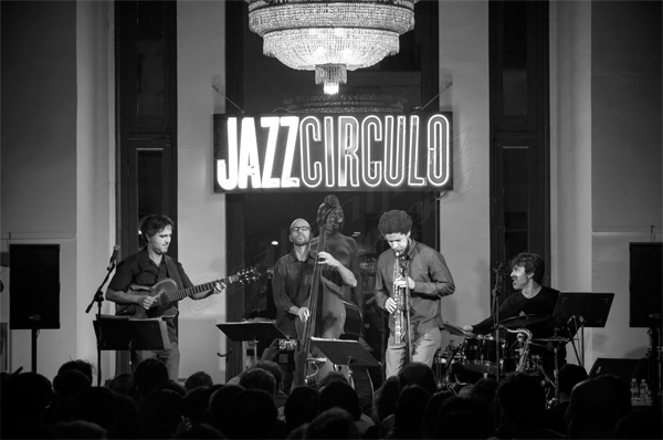 El pasado sábado, los aficionados madrileños tenían una cita ineludible con el ciclo Jazz Círculo. El guitarrista mexicano Hugo Fernández pisaba de nuevo los escenarios de la capital, y lo hacía con la responsabilidad de ver reconocida la excelencia de su segundo trabajo Cosmogram (Origin Records, 2015) por la mismísima Downbeat, que lo sitúa -con todo merecimiento- como uno de los mejores discos del año pasado. A su lado, el saxofonista Ariel Bringuez, recién retornado de la gira del 40 Aniversario de los míticos Irakere, la banda de Chucho Valdés. Completaba la formación una de las secciones rítmicas más rocosas y solventes del panorama nacional: Antonio Miguel en el contrabajo y Daniel García Bruno a la batería.