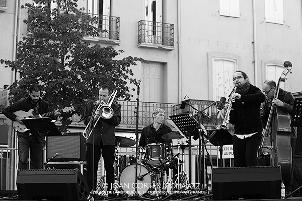 MANU CODJIA, GUEORGUI KORNAZOV, KARL JANNUSKA, EMILE PARISIEN & MARC BURONFOSSE (Gueorgui Kornazov Horizon 5t / 22ème Jazzèbre / Place de la Repúblique, Perpignan -France-, 2010)