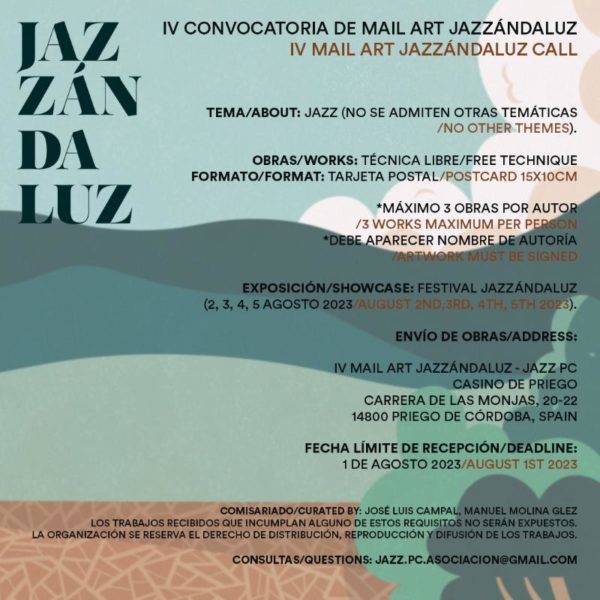 ![IV Convocatoria Mail Art/Arte Postal – Jazzándaluz 2023 [Noticias de jazz] Tomajazz 9.0 Mail Art 2022 1 IV Convocatoria Mail Art/Arte Postal – Jazzándaluz 2023 [Noticias de jazz] - Tomajazz 9.0 - Con motivo del Festival Jazzándaluz 2023, se ha realizado la la IV Convocatoria Mail Art/Arte Postal - Jazzándaluz 2023. Las obras participantes se expondrán en el mencionado festival.](https://tomajazz.com/web/wp-content/uploads/2023/04/Mail-Art-2022-1--600x399.jpg)