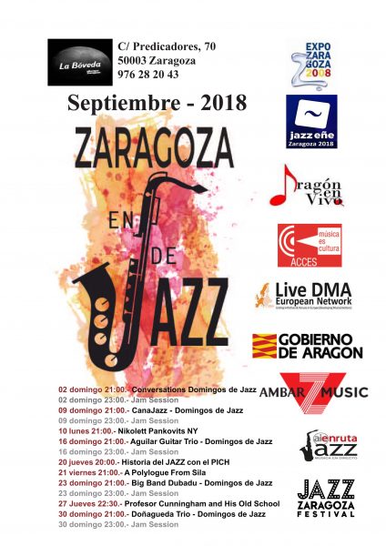 La Bóveda del Albergue (C/Predicadores, 70. Zaragoza) hace un hueco al jazz en su programación. En septiembre Domingos de Jazz y Jam Session todos los domingos a las 21:00 y 23:00 respectivamente. El lunes 10 Nikolett Pankovits (NY); el jueves 20 Historia del Jazz con el Pich; el viernes 21 A Polylogue From Sila; el jueves 27 Profesor Cunningham and His Old School.