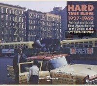 El blues como música reivindicativa, dentro de sus posibilidades, es el leit-motiv del doble CD Hard Time Blues 1927-1960, que cuenta en su título con la coletilla «Political and Social Blues Against Racism at the Origin of the Civil Rights Movement«. Omitiendo el orden cronológico, la recopilación se estructura en distintos bloques temáticos que muestran que el blues estaba pegado a la cruda realidad del día a día en Estados Unidos. Entre estos aparecen la discriminación tanto en el ejército (a pesar de que los norteamericanos de cualquier color de piel fueron reclutados como combatientes en la segunda guerra mundial, no fue hasta 1948 cuando en el ejército se produjo la integración racial de los estadounidenses), como fuera de él: «Uncle Sam Says», «Get Back», «Jim Crow Blues».También tienen su espacio la protesta contra el sistema judicial y penitenciario norteamericano, que era (y es) especialmente duro con la gente de color, así como los trabajos forzados en las cárceles que derivaban de las condenas: «There Is No Justice», «Parchman Farm Blues»; la pobreza en general: «No Job Blues», «Lonesome Cabin Blues», «Pawnshop Blues», «No Shoes». Las catástrofes naturales, que obviamente tenían unos efectos especialmente devastadores en la parte más pobre de la población independientemente de su color de piel, fue temática de los blues: «Back Water Blues», «When The Levee Breaks». La crisis del 29 y la esperanza que supuso el New Deal del presidente Roosevelt («Don’t Take Away my P.W.A.»*, «President Roosevelt»), así como también quejas sobre el resultado de este programa («Warehouse Man Blues») fue objeto de algunos blues. También se incluyen referencias políticas directas como ocurre en «Eisenhower’s Blues» (censurado por ser demasiado crítico con el presidente) o en «The Big Race» que hace referencia al triunfo de los demócratas sobre los republicanos en 1960, mientras que «The Alabama Bus» (1960) relata los hechos protagonizados por Rosa Parks en 1959; incluso surgen voces advirtiendo acerca de los peligros de las guerras: «Back To Corea Blues», «Whe World Is In a Tanble» y especialmente «Crazy World».