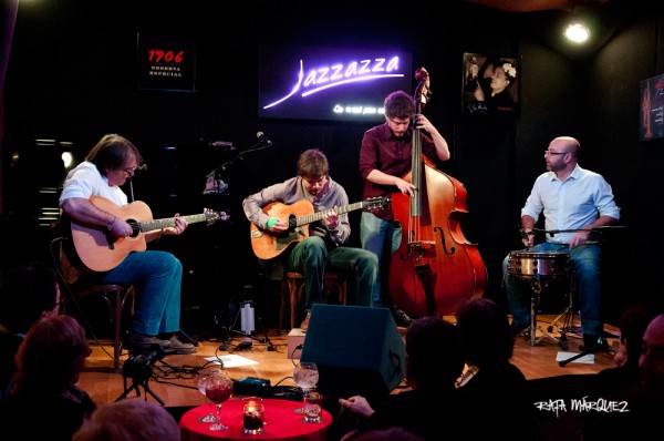 La segunda parte se presentaba aún más emocionante si cabe. Pasados lo momentos iniciales de tensión, previos a cualquier estreno, el cuarteto comenzó con la pieza llamada “Out Of Nowhere” (Green/Heyman), expuesta y desarrollada en parte de forma magistral por Juan Hurtado que se lució en una improvisación extraordinaria. Las influencias de músicos como Django Reinhardt, Jimmy Raney, Joe Pass, Stan Getz, Charlie Parker o Chet Baker, entre otros, son notorias en el lenguaje jazzístico de este gran guitarrista. Con “Dark Eyes”, “Coquette”, “Nuages”, “Sweet Georgia Brown”, “Bistro Fada”, y “Swing 48”, dejaron muy alto el buen nivel en el que se encuentra la formación, convirtiendo su saber hacer en un disfrute de improvisaciones alternadas y a veces compartidas que mantenían atentos a una gran mayoría de los presentes en el local. Brillaron también los solos de Quico Pérez en varios de los temas propuestos como en “Nuages”, la conocida composición de Django, en el que dispuso de fraseos al más puro estilo. El concierto rozaba casi el final con “Minor Swing”, destacando la improvisación del contrabajista Pedro Molina, que por cierto estuvo formidable a pesar de su laborioso papel en el grupo, junto a Fernando Gómez, base clave de la banda que destaca por su percusión sólida y una excelente métrica. El grupo despidió su concierto con un bis a petición del público, el tema llamado “For Vic”, una alegre y vigorosa composición para un final apoteósico.