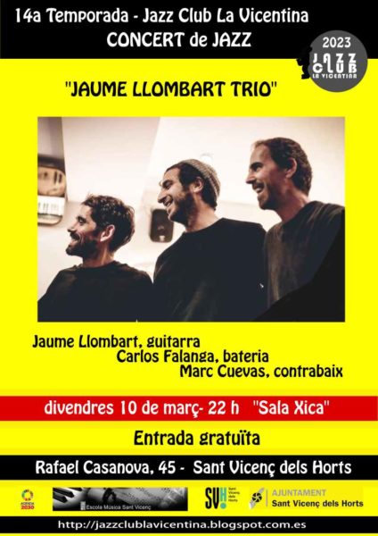 ![Jaume Llombart Trio (10 de marzo de 2023. Jazz Club La Vicentina, Barcelona) [Noticias de jazz] 1 Tomajazz Jaume Llombart Trio (10 de marzo de 2023. Jazz Club La Vicentina, Barcelona) [Noticias de jazz] El viernes 10 de marzo a las 22:00 actuará en Jazz Club La Vicentina el Jaume Llombart Trio, con entrada gratuita.](https://tomajazz.com/web/wp-content/uploads/2023/03/Jaume-Llombart-Trio-Jazz-Club-La-Vicentina-20230310WEB-800x425.jpg)