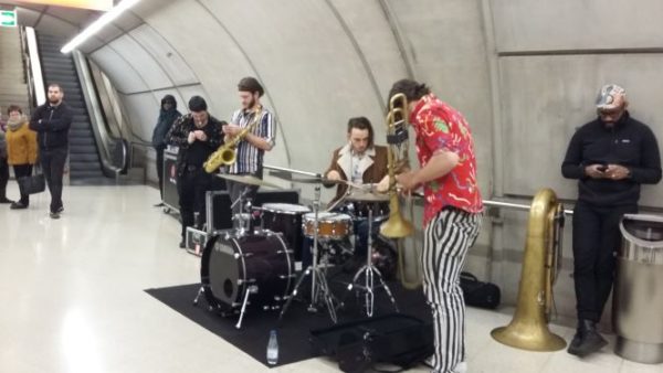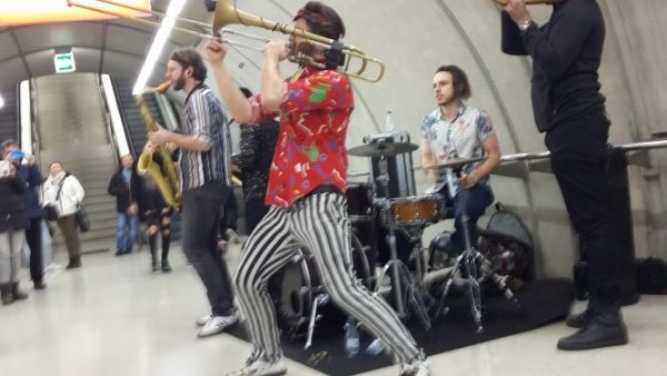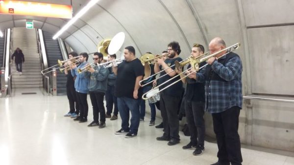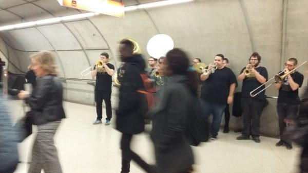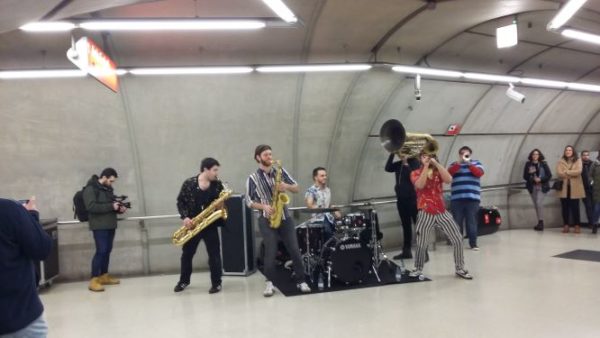 Los vínculos entre el jazz y el suburbano vienen de lejos y se remontan – muy probablemente – al clásico «Take the A-Train», compuesto por Billy Strayhorn en 1939 y popularizado por Duke Ellington y su orquesta. Desde entonces el tren subterráneo ha servido de inspiración a músicos, compositores, bandas de jazz, clubes nocturnos… En Bilbao, sin embargo, es la primera vez que los pasajeros en tránsito pueden disfrutar de los acordes de una marching band, – tres, en realidad – que se desplaza de estación en estación ofreciendo actuaciones breves (unos 20 minutos), aunque intensas.