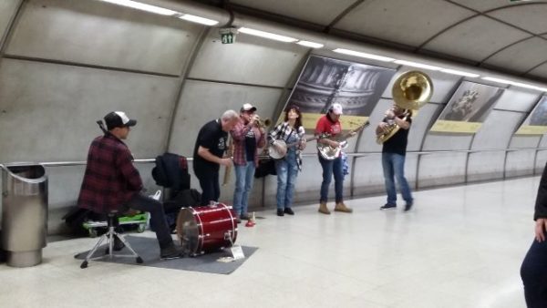 El último de los grupos, los pamploneses Broken Brothers, es otra formación veterana en esto de la música callejera, con más de diez años a sus espaldas actuando en todo tipo de festejos y animando con un jazz, blues o gospel que interpretan mirando a Nueva Orleans. Y hay que decirlo, cuando ponen en marcha su maquinaria musical – trompetas, trombones, saxos, bombo… once músicos en total – el sonido de las locomotoras que llega desde los andenes se desvanece por completo. Laura y Bryan, amantes del volumen alto, aquí no tienen motivo de queja. Es el último día y cuando todo acabe, en conjunto, habrán sido más de veinte actuaciones, acompañando con sus pasos de baile y sus palmas a los músicos, y animando a los dubitativos espectadores a compartir unos minutos de diversión. Como dijo un viajero que estaba a mi lado al retomar su camino: “¡Estos tíos me han alegrado el día!”.