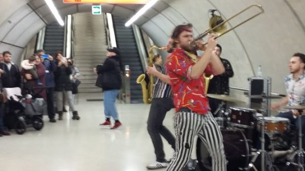 Y aquí estamos, un miércoles a la una del mediodía, a pocos metros de las validadoras de la estación de Abando, en Bilbao, con los neoyorkinos Lucky Chops, un grupo que lleva ofreciendo su música al aire libre desde el 2006. Ellos definen su estilo como “brass funk de alta energía”, una energía que, no cabe duda, saben cómo transmitir al público que se detiene a escucharles. Aunque la verdad es que una buena parte de los que estamos aquí, hemos venido ex profeso, atraídos por la posibilidad de disfrutar de un poco de música en directo, a medio día. El número de componentes varía y en esta ocasión son seis quienes componen la banda liderada por Josh Holcom, que al trombón de varas y con camisa hawaiana roja – su seña de identidad – dirige la interpretación. Los músicos se desplazan de una estación a otra y un pequeño equipo les traslada y ayuda a montar la batería de Nate Werth. Pero en apenas unos minutos todo está listo y comienzan a tocar. Bryan y Laura no tardan en unírseles con sus pasos de baile y de pronto el hall de la estación se convierte en una inesperada sala de espectáculos. El ambiente mejora por momentos y alcanza su clímax cuando cierran con una divertida versión del “Funky Town”, de Lipps Inc.