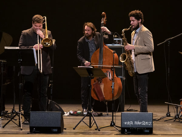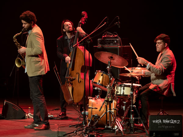 El líder de la formación hizo gala de su buen humor, y simpatizó con los asistentes desde el primer momento de la actuación, que iniciaron con el tema “Bost”, pieza homónima que también encabeza el disco. La enérgica entrada de la composición, basada en el palo flamenco de la granaína, comenzó a dar una buena idea de lo que iba a ser el desarrollo posterior de la sesión. Tras la exposición del tema, fue Caminero el que inició la rueda de improvisaciones, seguido del pianista Sánchez, que aportó una buena dosis de intensidad con sus ágiles y flexibles fraseos. Brínguez y Martín alargaron el final de la pieza, alternando sus diálogos para acabar de forma apoteósica. “Blues para Gerardo Nuñez”, dedicado al gran guitarrista, fue el segundo tema del repertorio. Una soleá por bulerías, con una extensa y colorida exposición que dejó paso a los solos del contrabajo con arco, el trombón, el saxo tenor, y una contundente muestra del baterista Olivera. El contrabajista anunció el siguiente tema como una pieza conceptual de un minuto de duración llamada “Tema para Instagram”, para continuar con “Variaciones Instagram”, en la que Brínguez, Martín y Sánchez, ejercieron su labor como protagonistas principales, con solos de una gran consistencia. En “Manoli”, tema inspirado en uno de los personajes imaginarios de la película El Plan (2019) basada en un guión de Polo Menárguez e Ignasi Vidal, se adentraron en un paisaje sonoro onírico y sutil, de gran belleza, dejando en un estado de éxtasis a los oyentes que se encontraban en el teatro.