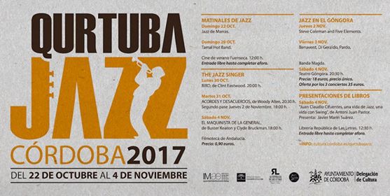 Entre el 22 de octubre y el 4 de noviembre de 2017 tendrá lugar Qurtuba Jazz 2017 en Córdoba. Actuarán, entre otros, Tamal Hot Band, Steve Coleman and Five Elements, Benavent – Di Geraldo – Pardo y Banda Magda. También se proyectarán distintas películas (Bird, Acordes y desacuerdos, y se presentará “Juan Claudio Cifuentes, una vida de Jazz, una vida con Swing” de Antoni Juan Pastor. Toda la información en http://cultura.cordoba.es/qurtubajazz/programacion/