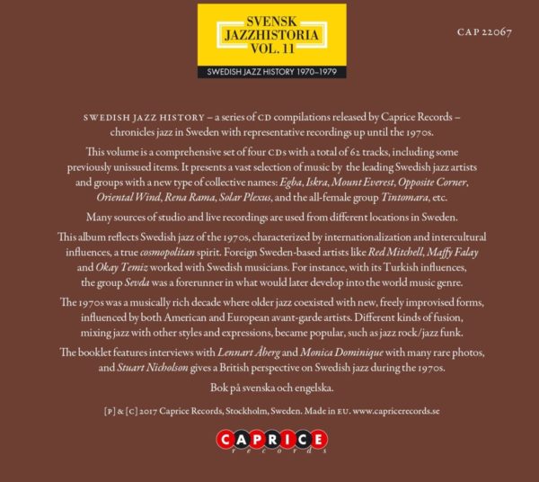 Svensk jazzhistoria (Historia del jazz sueco) es una cuidada colección discográfica que muestra el desarrollo del jazz en Suecia a través de sus grabaciones históricas. Publicada por Caprice Records, el sello estatal sueco, los primeros diez volúmenes cuentan la historia del jazz en Suecia de 1899 a 1969. Esta última entrega, la undécima, presenta la década de 1970. En cuatro CDs –con un total de 62 temas, más de 5 horas de música, y un librillo adjunto de 188 páginas– el volumen compendia de forma extensa y variada el jazz sueco en un período de tiempo cargado de profundos cambios y transformaciones. Una década en la que se sentaron las bases de lo que hoy se denomina “jazz escandinavo”, a través de nuevas formas de improvisación, las hibridaciones del rock progresivo, la recontextualización de la música folclórica, las experimentaciones vanguardistas de la música académica y el free jazz.