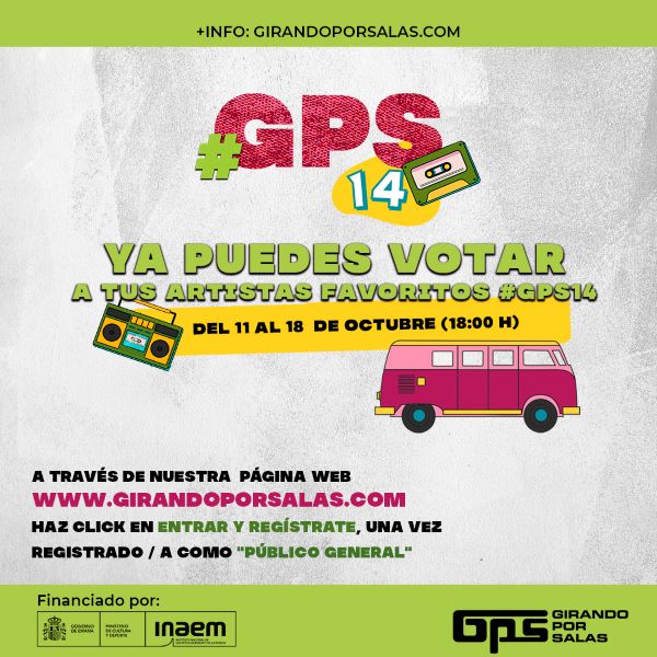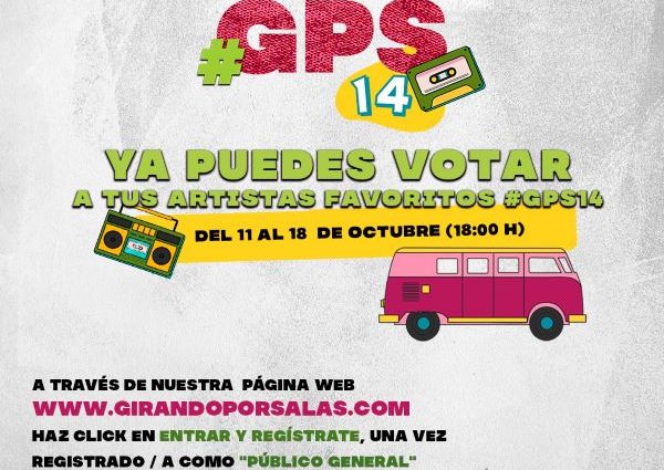 El miércoles 11 de octubre se abre la votación popular de la edición #GPS14, desde las 11:00h, hasta el miércoles 18 de octubre a las 18:00h. L@s interesad@s en participar en esta votación para elegir a sus bandas y/o solistas favoritos pueden entrar en la web de Girando Por Salas con su usuario y contraseña (o registrarse para ello como usuario tipo «Público general» si no lo han hecho previamente) y votar por sus opciones preferidas en la pestaña «Bandas #GPS14 >> Bandas Aprobadas Seleccionables» de la web de Girando Por Salas, en el siguiente enlace: https://www.girandoporsalas.com/bandas/