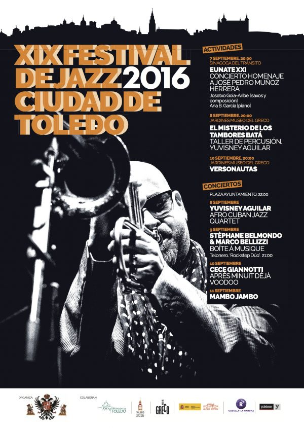 Entre el 8 y el 11 de septiembre de 2016 tendrá lugar el XIX Festival de Jazz Ciudad de Toledo, con conciertos en la Plaza del Ayuntamiento. A las 22:00 actuarán Yuvisney Aguijar Afro Cuban Jazz Quartet (jueves 8), Stèphane Belmondo & Marco Bellizzi “Boîte A Musique” (viernes 9), Cece Giannotti “Aprés Minuit Déjà Voodoo” (sábado 10), y Mambo Jambo (domingo 11).