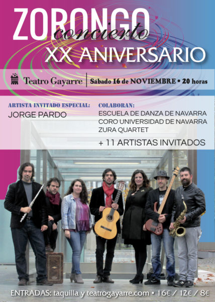 El grupo Zorongo celebra su vigésimo Aniversario con un concierto especial en el Teatro Gayarre de Pamplona el 16 de noviembre de 2019 a las 20:00. Para esta ocasión tan especial el grupo contará con Jorge Pardo como invitado especial, y la colaboración de la Escuela de Danza del Gobierno de Navarra, el Coro Universidad de Navarra, Zura Quartet y con los artistas invitados Paco Ocaña, Íñigo Porto, Diego Belzunegui, Juan Carlos Aizpún, Maritere Acosta, Tamara Ayllón, Unai Otegi, Marte Huarte, Itxaso Moriones, María Etxamendi y Tamara Hurtado bajo la dirección musical de Ekhi y Urko Okaña.